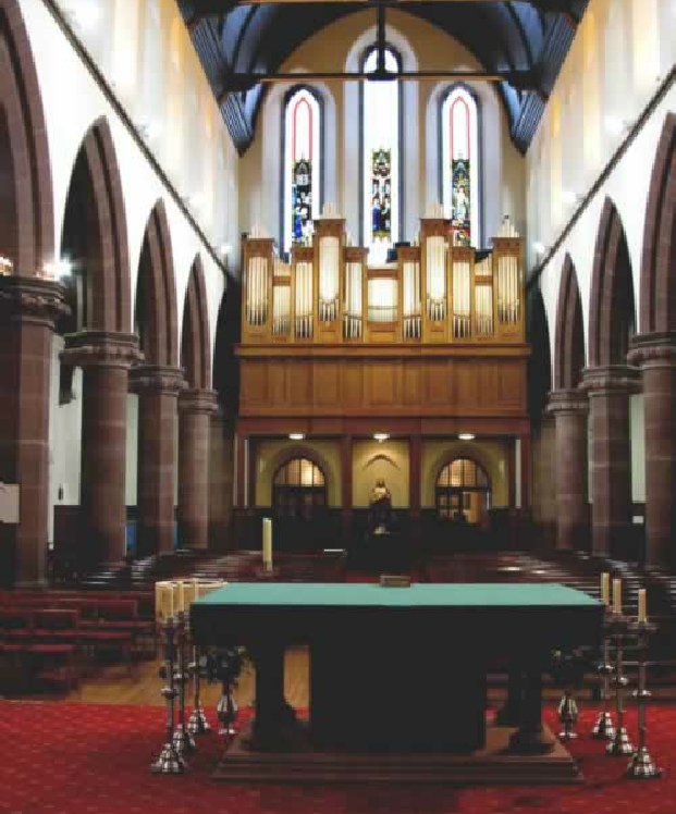 In 1926, J J Binns, provided a 3 manual organ for the Parish Church of Queens Park, Glasgow ,which closed in February 2000, but this historic organ has been rescued and given a new home. George Sixsmith & Son Ltd. have completely restored it and converted the actions to electro-pneumatic. The oak main case, which was designed by Andrew Sixsmith, is a fine example of British workmanship and is placed at the west end of the church. The Swell, Great and Pedal Divisions, together with the High Pressure Tromba unit, are in the main case, while the Choir Division is housed in a chamber behind the St. Werburgh Shrine, adjacent to the Altar steps. There is a digital transmission from a detached drawstop oak console, situated opposite the Choir Division. The organist can see and hear well.